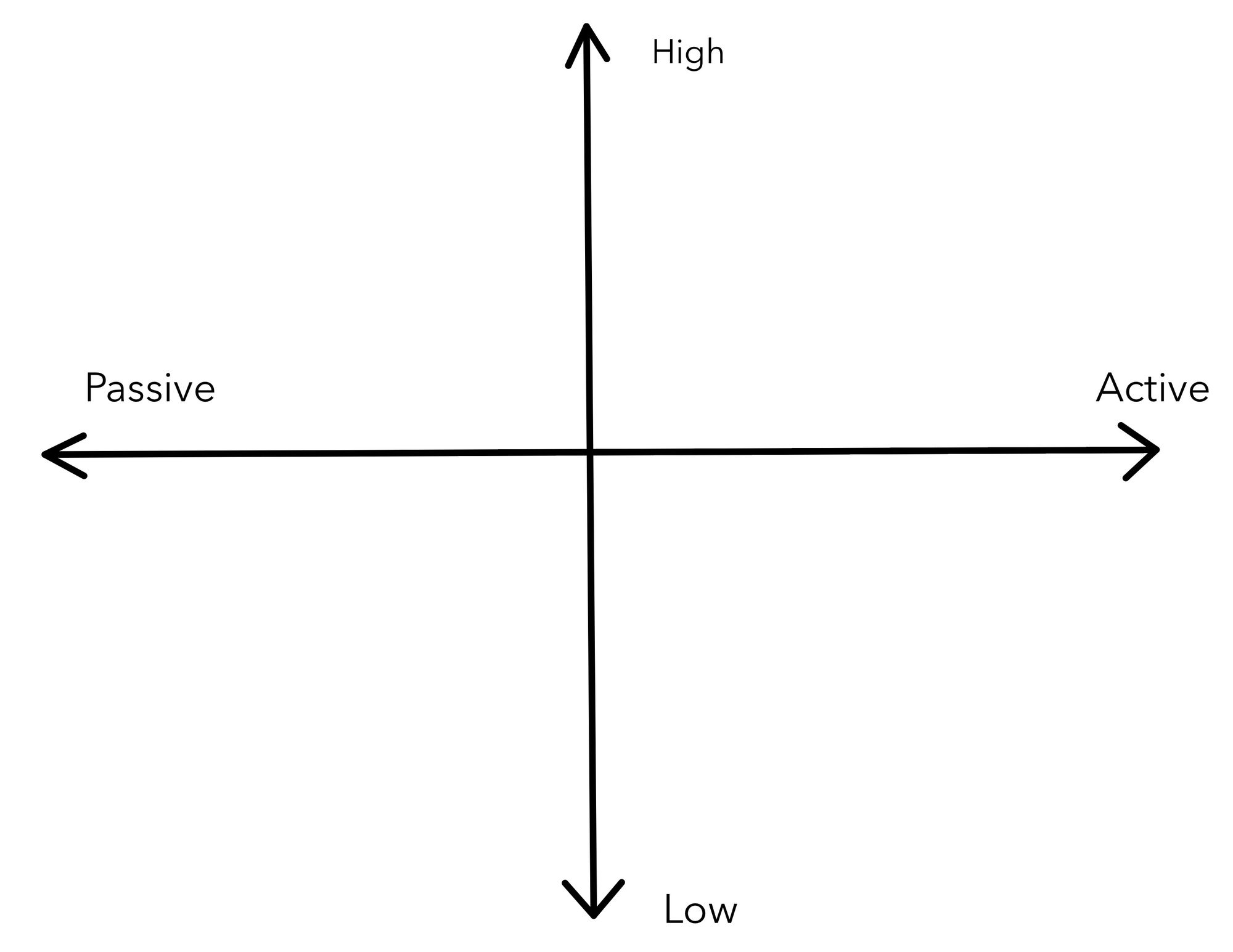 When you put the two together, you can start mapping your metrics on a two-dimensional matrix as shown. An active, high-value metric likely is worth the amount of time, effort, and risk associated with the tactics that affect that metric because you can use it to explain the story of what your team is doing and why. A passive, low-value metric might only be worthwhile as a byproduct of tactics intended to impact some other metric—a minor supporting character, if you will, in your story.